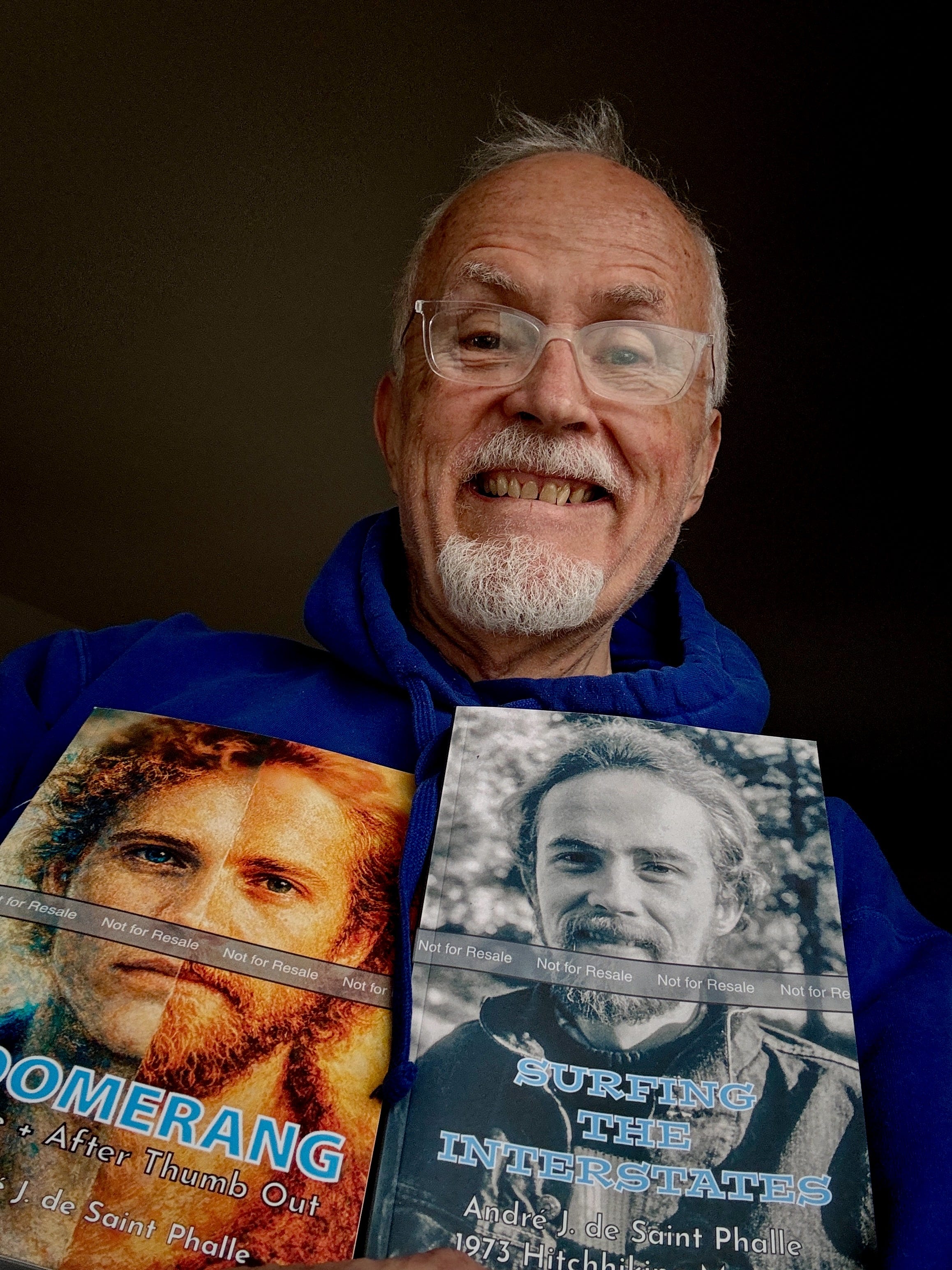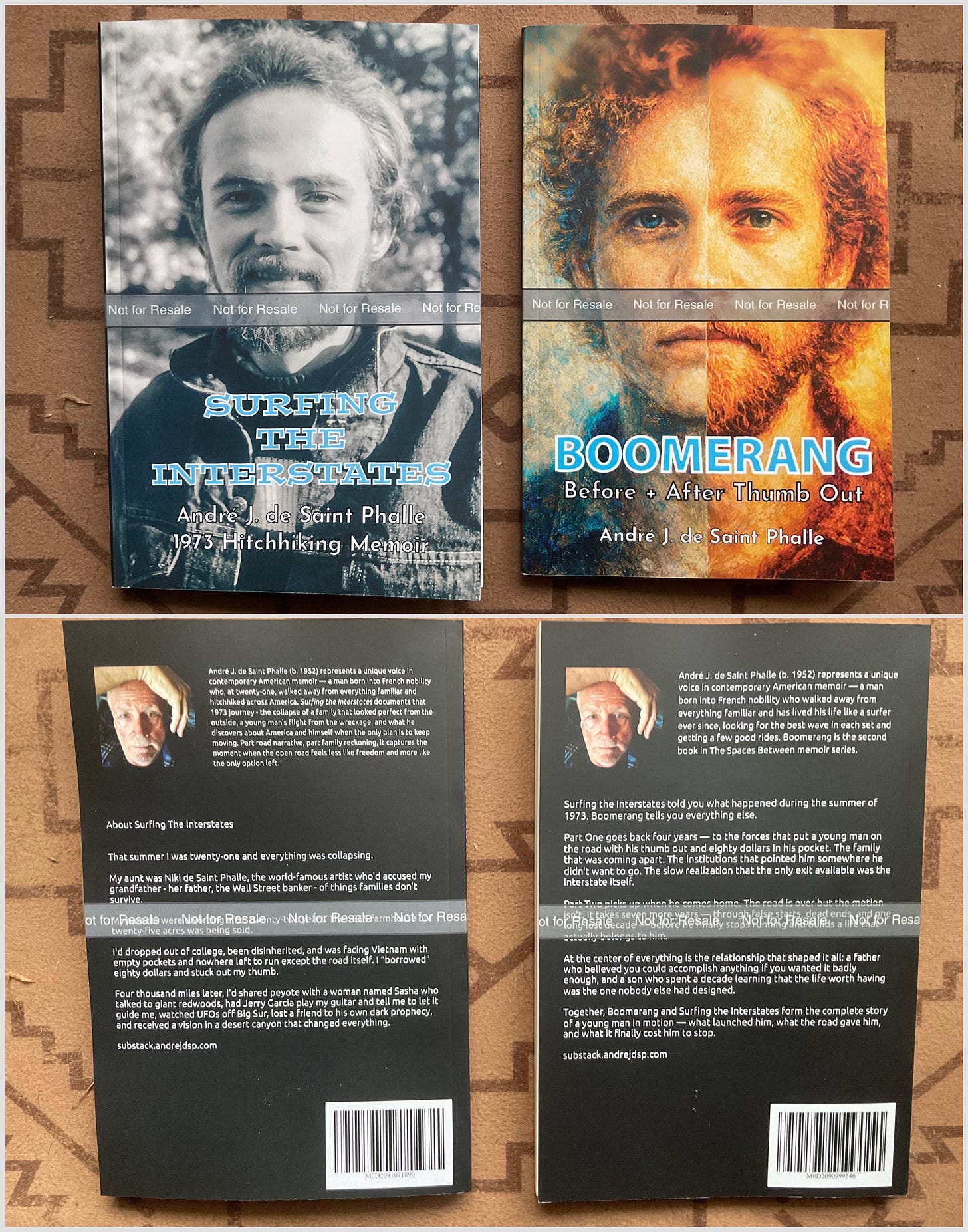 Surfing the Interstates: A 1973 Hitchhiking Memoir is the first book of The Spaces Between trilogy. Boomerang: Before + After Thumb Out is its companion — a prequel and sequel in one volume. Part One goes back four years to the forces that put a young man on the road with eighty dollars in his pocket. Part Two picks up when he comes home and spends seven more years learning how to stop running.