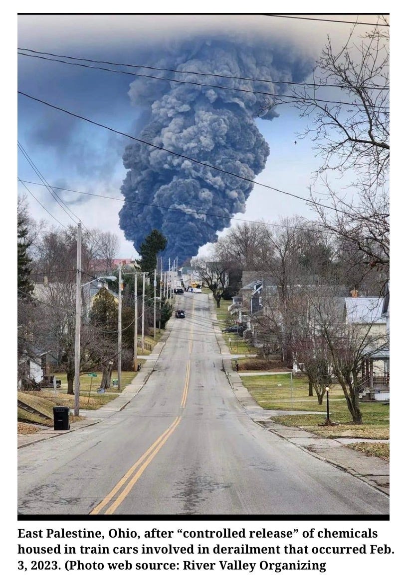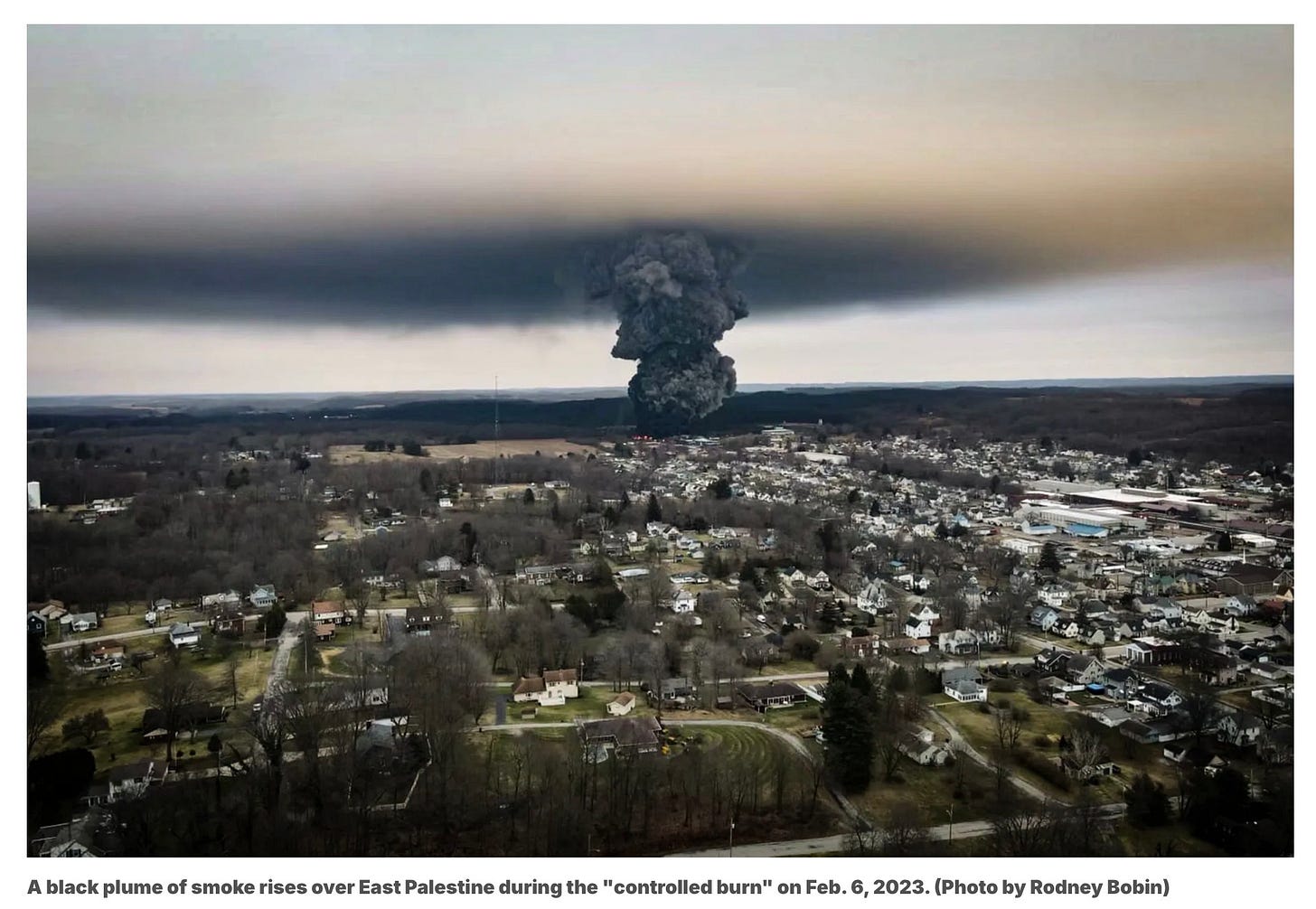 On February 3, 2023, a Norfolk Southern freight train carrying hazardous chemicals derailed in East Palestine, Ohio — a small town of 4,700 people near the Pennsylvania border. Three days later, officials conducted a “controlled burn” of vinyl chloride and other toxins, sending a massive plume of black smoke over the town and surrounding farmland. Residents were evacuated, then told it was safe to return. Fish floated in the creeks. Animals sickened. The story cycled through the news and faded, as these stories do.