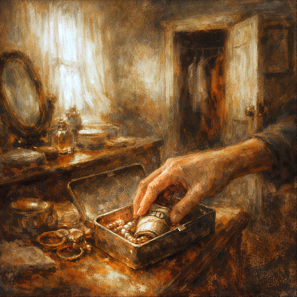 I ended up in my parents’ room. Something drew me to a small closet near my mother’s dresser. Inside a tin — jewelry and a roll of twenties. Four bills. Eighty dollars. A surge of adrenaline. She wouldn’t mind if I borrowed this. Should I leave a note? No time. Like finding an escape hatch in a submarine going down.