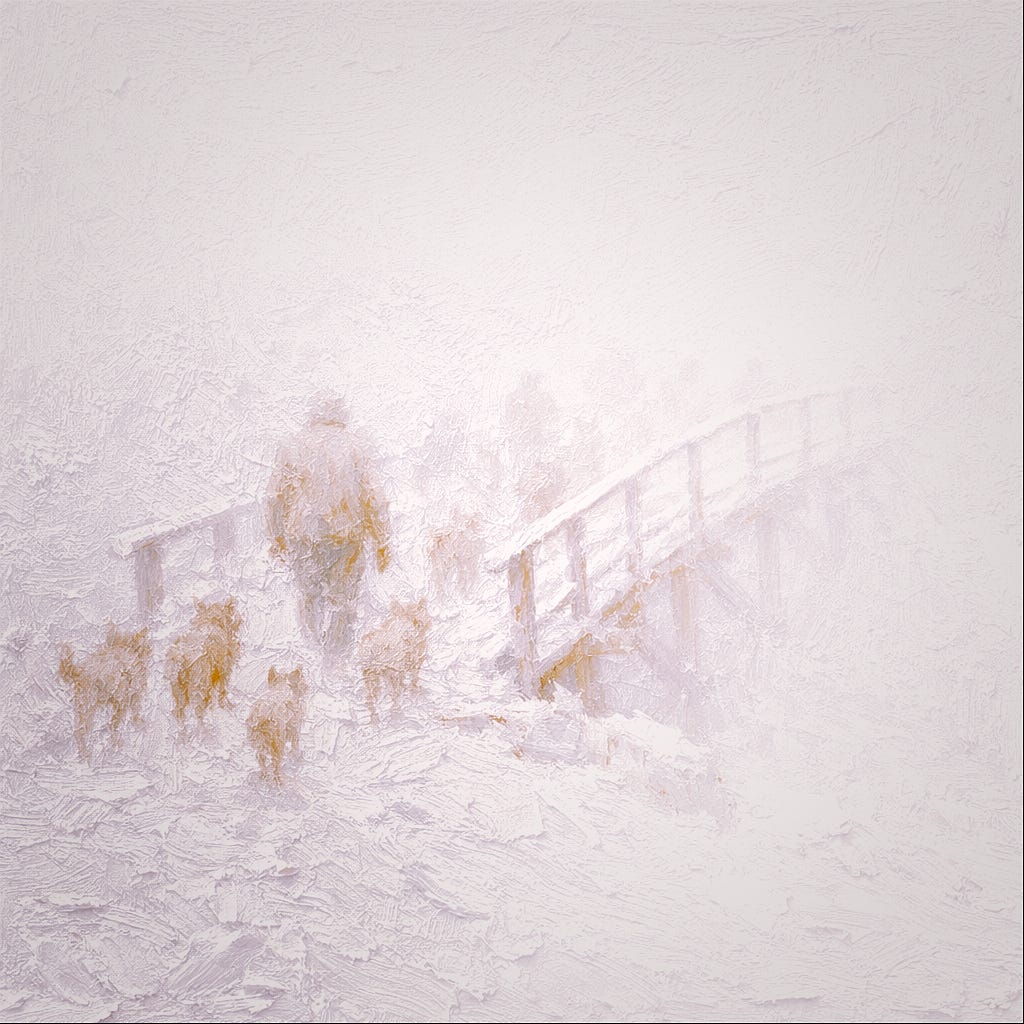 The dogs don’t hesitate. Tara goes first, then Cashel, then Brer and Rusty. One by one they cross the bridge and dissolve into the white on the other side, their shapes softening, fading, becoming part of the snow until they’re gone. Blue follows, the black lab, his drummer tail beating one last rhythm against the white, and then he's gone too.