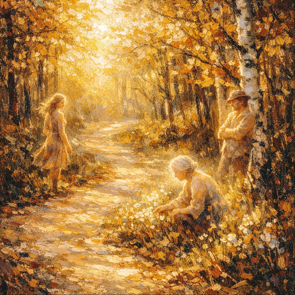 Others appear along the trail as the leaves fall and the light fades. I don’t name them all. Some I recognize from behind—a posture, a way of walking, a coat I haven’t seen in decades. Some turn to me and smile. Some don’t. They’re all exactly as they were when I loved them most, which is to say they’re all younger than me, which is to say they’re all as I remember them, which is to say they’re mine.