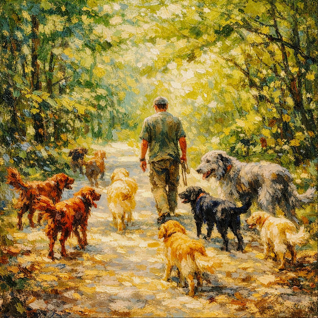 A quarter mile later, Cashel appears. The Irish wolfhound, massive and gray, my mother's pride and joy, loping out of a stand of birches with that hitch in her stride she carried ever since the neighbor's beagle ripped her chest open — dozens of stitches, and the vet said she was lucky to survive. Then Rusty, the Irish setter, a copper flash in the green light, moving with that effortless ranging stride I remember from the woods behind Ledge Acres — my first dog, my deepest dog love, who ran free across square miles of forest and once dragged a deer leg home like a trophy. And Brer—my first golden retriever, the one who couldn’t come with me to Antigua and ended up living with my mother for four years.