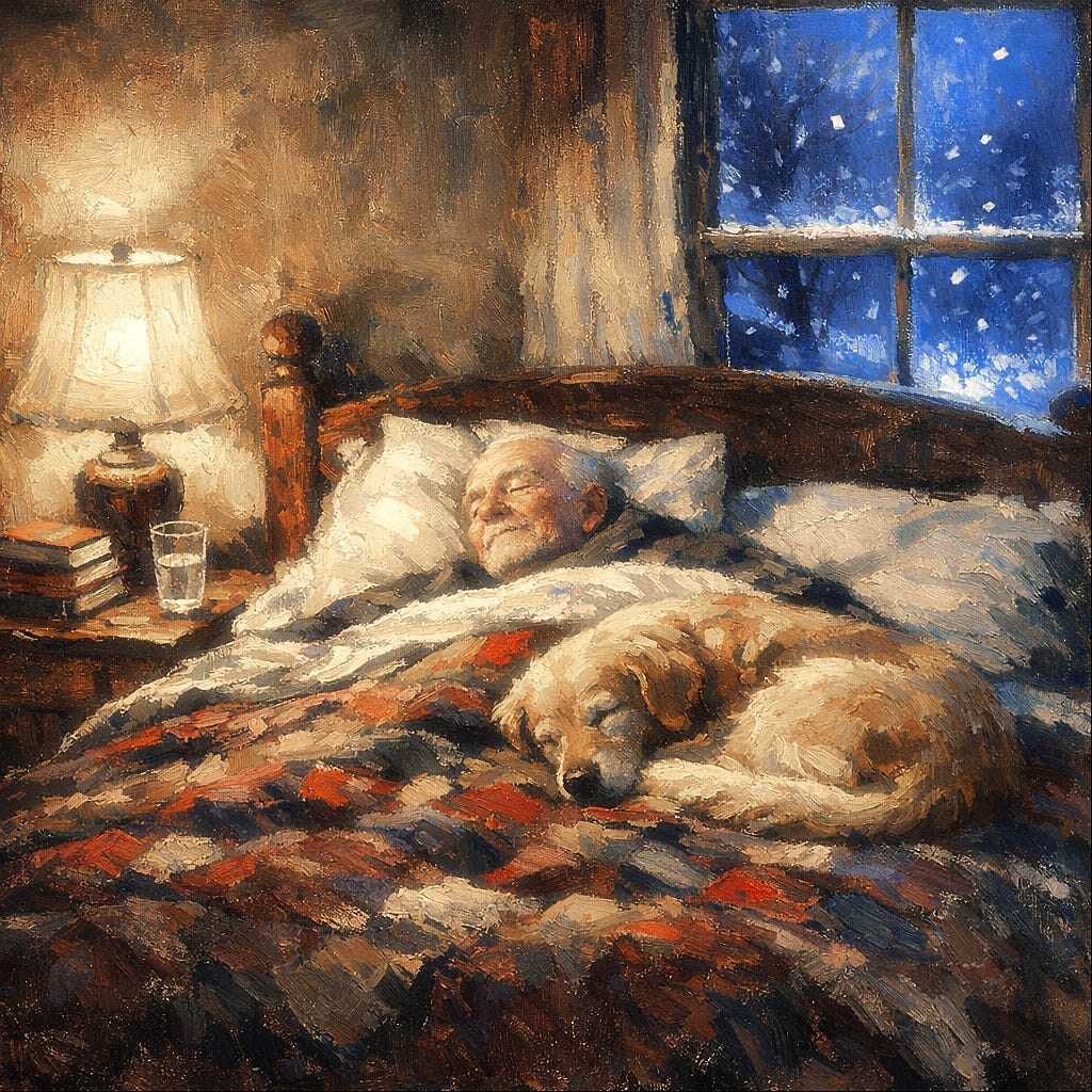 The man in the bed is still. The dog beside him is still. Somewhere in the house, Veronica is already awake, beginning her day. He had almost lost her once, over something small that felt enormous at the time. He never made that mistake again. The memoir on the nightstand is bookmarked to a page he will never finish. The glass of water catches the lamplight and holds it.