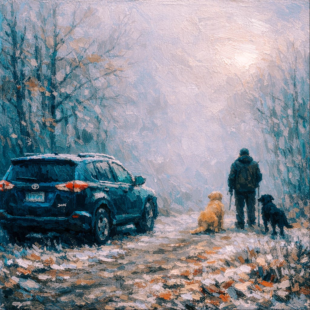 Blaze and Blue are already pressing against the tailgate, and when I pop it they pour out in that way retrievers do—not jumping, exactly, but flowing, like water finding its level. Blue shakes once, tags jingling, and looks up at me with that expression I’ve never been able to read. Not a question. More like confirmation. Blaze is already nose-down in the frost, following something only he can smell.