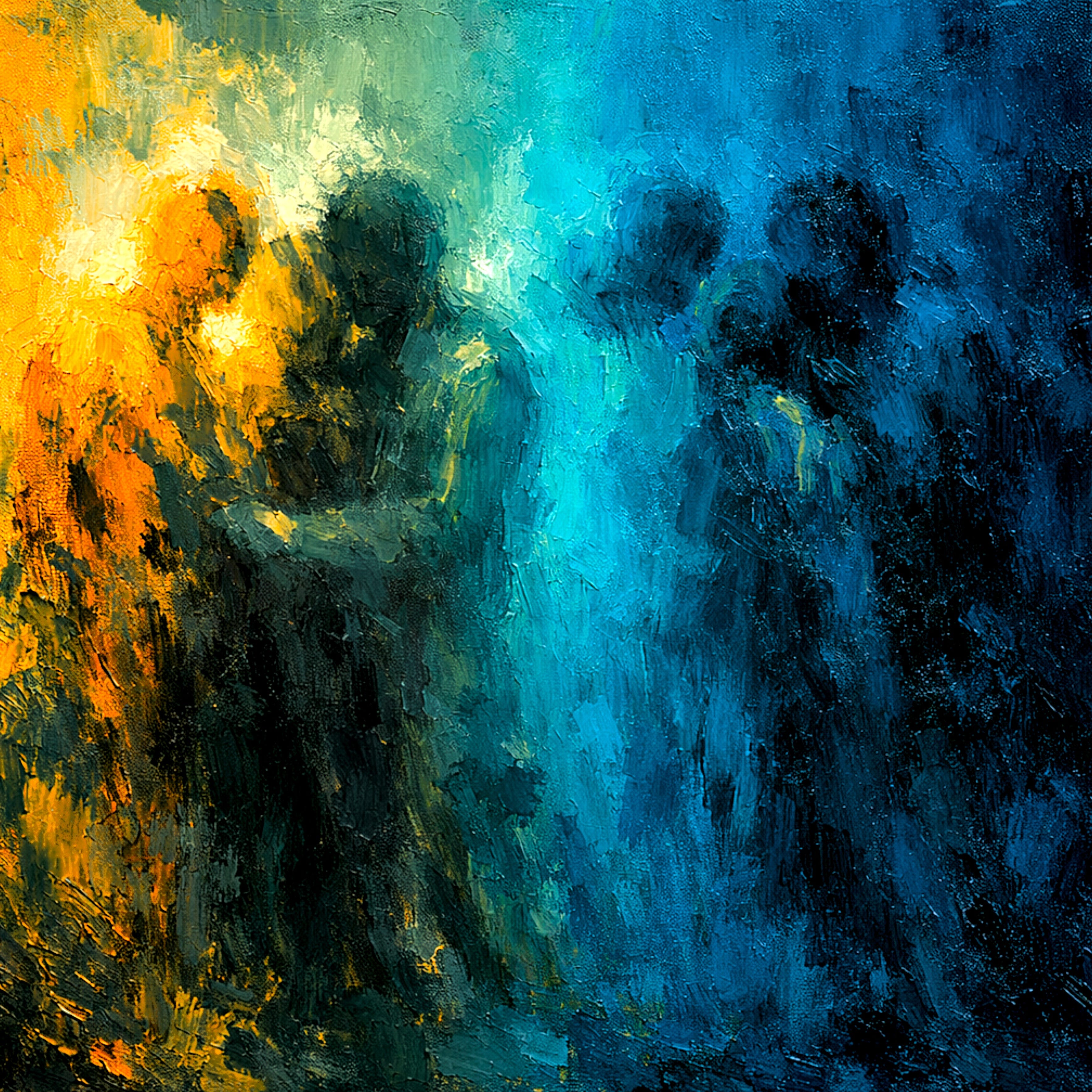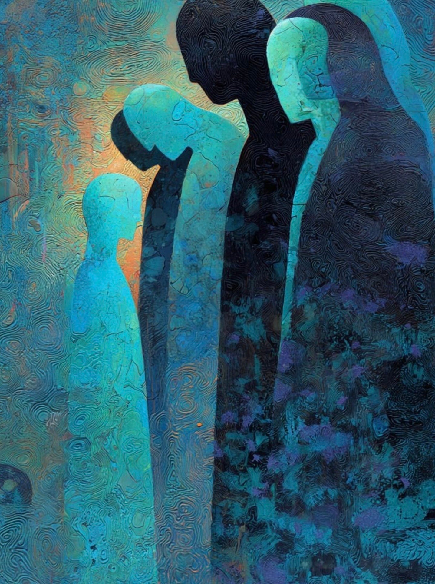 “Abstract oil painting, four or five human figures standing close together in blue and teal darkness, faceless, their bodies merging into and emerging from shadow. Some figures lit from behind with warm amber and copper light, others dissolving into deep indigo and black. The figures lean toward each other as if sharing secrets or holding each other up. No sharp edges anywhere — everything bleeds into everything else. Heavy impasto texture, visible brushstrokes and palette knife work, the paint itself almost sculptural. The mood is tender and haunted simultaneously. The palette moves from warm gold and copper on the left edge through turquoise and teal in the center to deep midnight blue and black on the right. The figures should feel like memories — present but not solid, recognizable as human but impossible to identify. Like looking at your family through water. Like remembering a room full of people you loved who are no longer alive.”