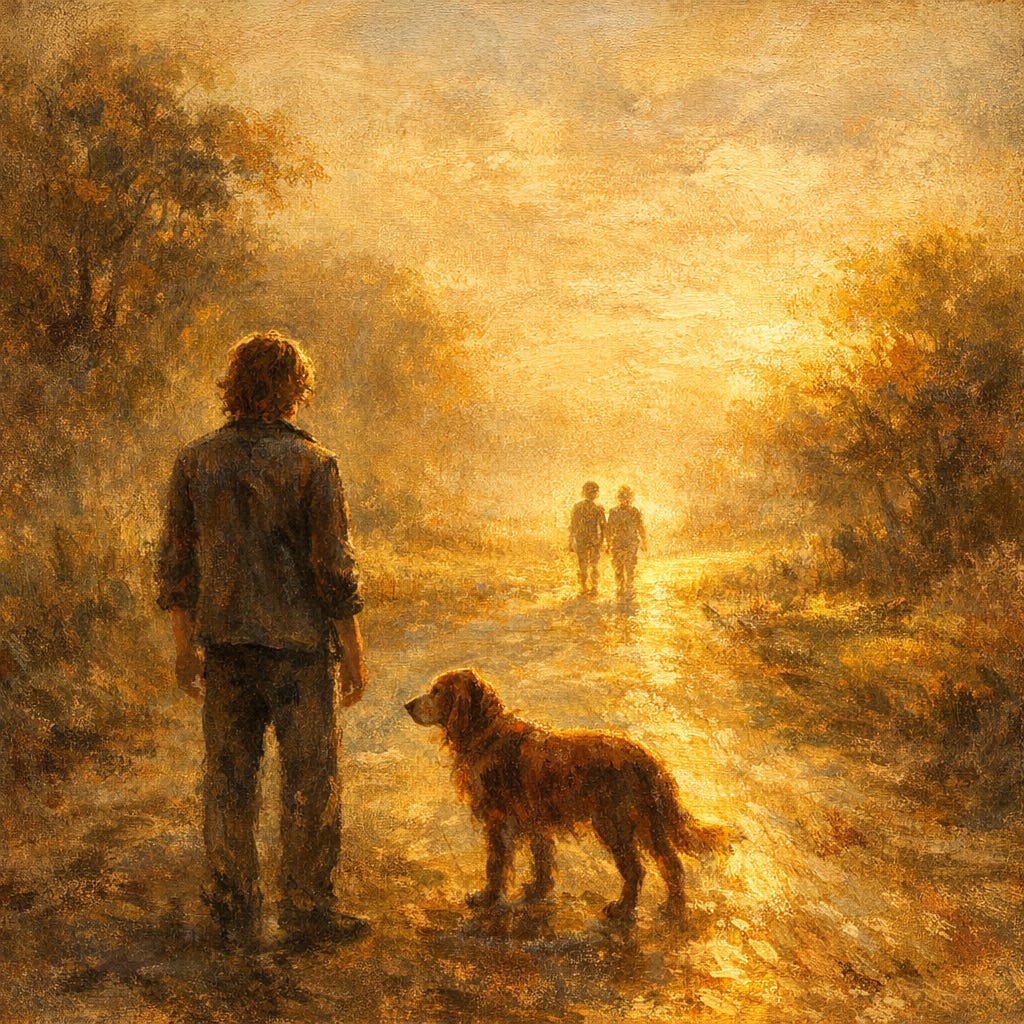 But the scene kept following me around. Because the moment itself — standing on Oregon Road with an arthritic dog, watching Charlie and Anni come over the hill holding hands in their school uniforms — that moment is real. It happened. And it’s the truest portrait I have of who I was in the fall of 1973, between the road and whatever came next.