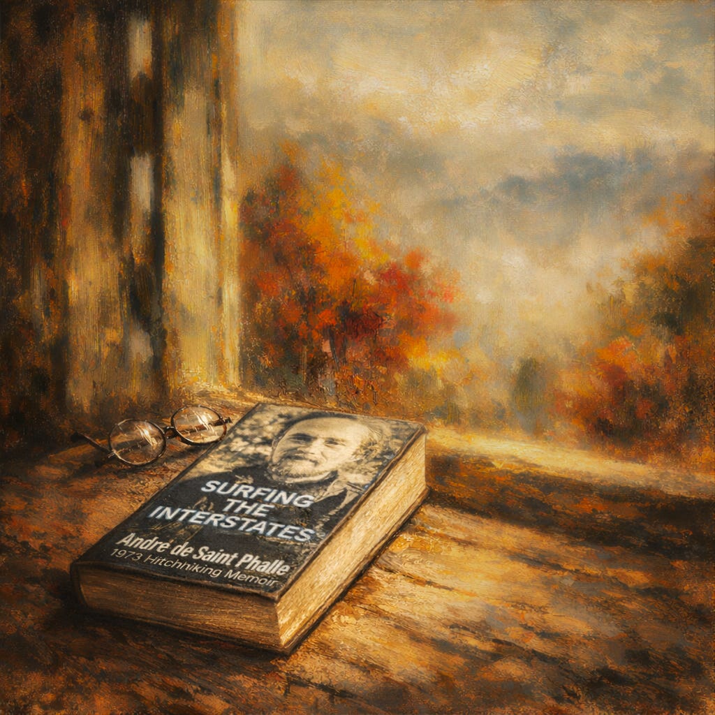 That fall I discovered Anthropic’s Claude, and I began interfacing the AI with my iOS writing app, Scrivener. I also started recording voice memos. Originally I wanted to write a screenplay — the old film school dream that life had rerouted but never quite killed. Funny how the thing your father blocks at eighteen keeps knocking at seventy-two. Over the months that followed I invested unbelievable amounts of time learning how to efficiently record my thoughts on a walk into my phone, how to transcribe them later with different software. I tried Aiko, NovelCrafter, Sudowrite. Each taught me something. None of them stuck. But the impulse kept pushing, and over the next two years I ended up writing the memoir that became Surfing the Interstates.