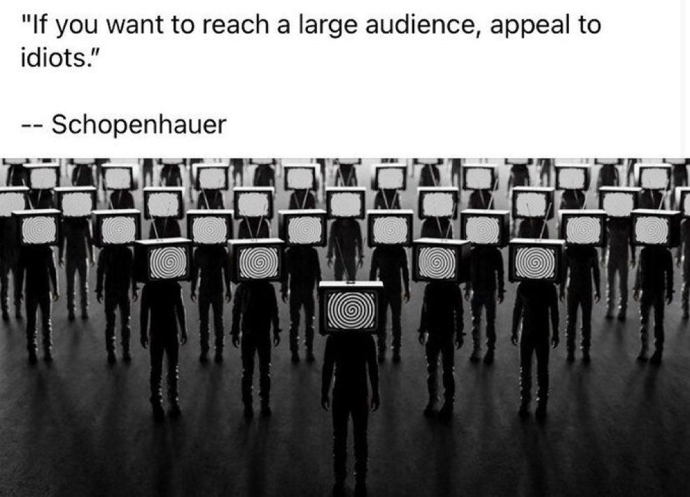 That quote found me this morning, floating above an image of faceless figures with television sets for heads, each screen showing the same hypnotic spiral. The masses, the market, the algorithm. The crowd you’re supposed to court if you want to make it.