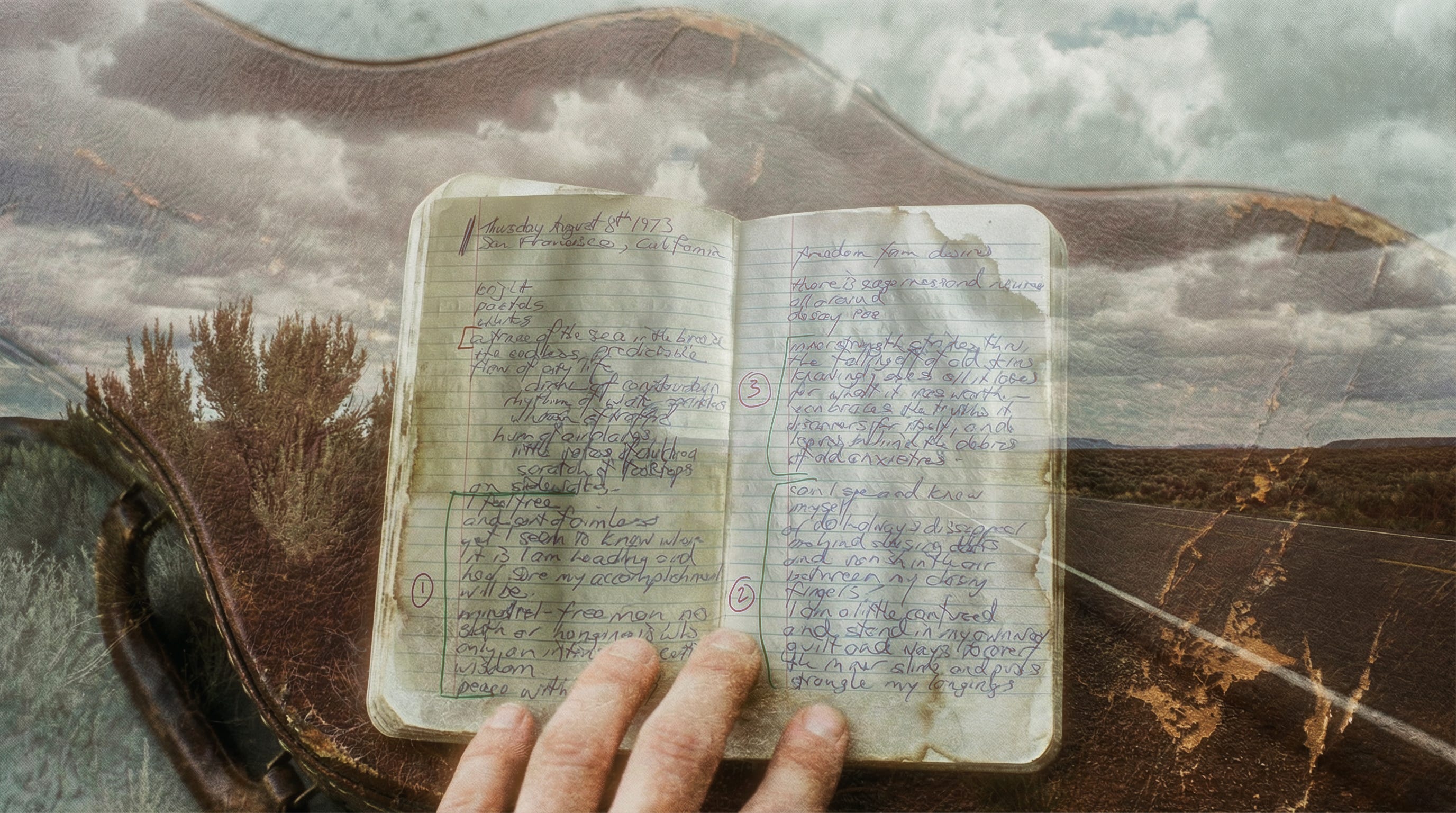 We built a timeline. We researched the cultural context of 1973 — what was happening in the music scene, the anti-war movement, the counterculture. We created a master document of themes and motifs: the spaces between, perpetual motion, bodies as truth-tellers, weather as fate.